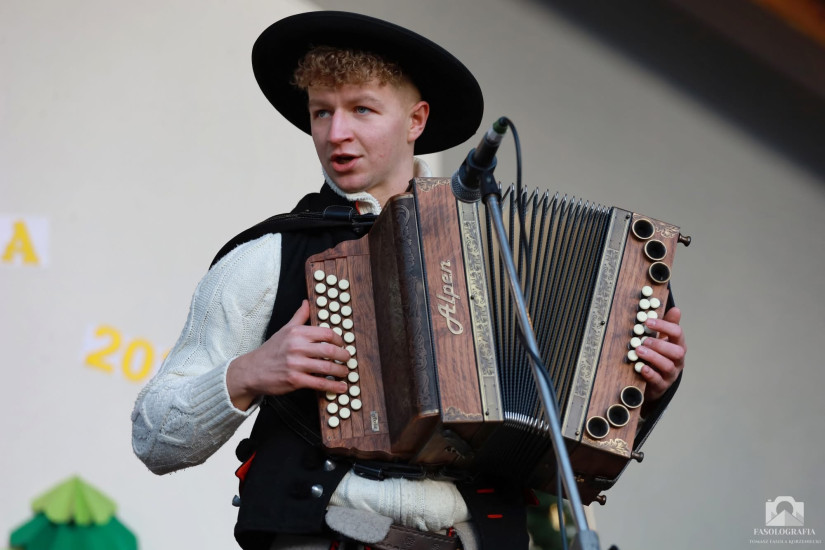 Dominik Kubica: Obecnie staram się na wiele sposobów rozwijać swoją pasję do góralszczyzny. Wciąż aktywnie uczestniczę w życiu zespołu – tańczę, śpiewam i gram, co przynosi mi ogromną satysfakcję i pozwala na stały kontakt z tradycją. Oprócz tego dzielę się swoją wiedzą i umiejętnościami, ucząc innych gry na heligonce oraz śpiewu góralskiego. Dzięki temu mam poczucie, że wnoszę swój wkład w przekazywanie naszej kultury młodszym pokoleniom. W wolnym czasie chętnie gram w kapelach góralskich na różnego rodzaju wydarzeniach – od imprez okolicznościowych po spotkania integracyjne. To daje mi nie tylko możliwość rozwijania swoich umiejętności, ale także budowania więzi z innymi miłośnikami góralskiej muzyki. Jednym z najważniejszych wydarzeń w roku, które szczególnie mnie angażują, są Dziady Noworoczne i Gody Żywieckie. Uwielbiam te tradycyjne obchody, bo integrują one nie tylko lokalną społeczność, ale także pasjonatów z różnych miejsc. To wyjątkowy czas, gdy spotykamy się, gramy wspólnie na heligonkach, wymieniamy się melodiami oraz starodawnymi przyśpiewkami. Każde takie spotkanie to okazja do nauki, inspiracji i tworzenia czegoś nowego. Dzięki temu czuję, że kultura góralska jest żywa i wciąż może się rozwijać w nowoczesnym świecie.